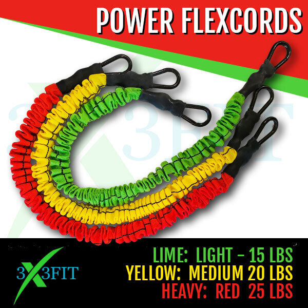 Are these cords different than the standard 3X3FIT tension cords? Yes, they are uniquely different and do not take the place of the standard 3X3FIT cords. The POWER FLEX CORDS function differently with several different tensions (15, 20 & 25 lbs.), flexibility, stretch and the comfort of the protected cord sleeve against the skin allowing for brand new exercises and 3X3FIT workouts. Check out the first three workouts (below) of many new to come with our brand new 3X3FIT POWER FLEXCORDS.